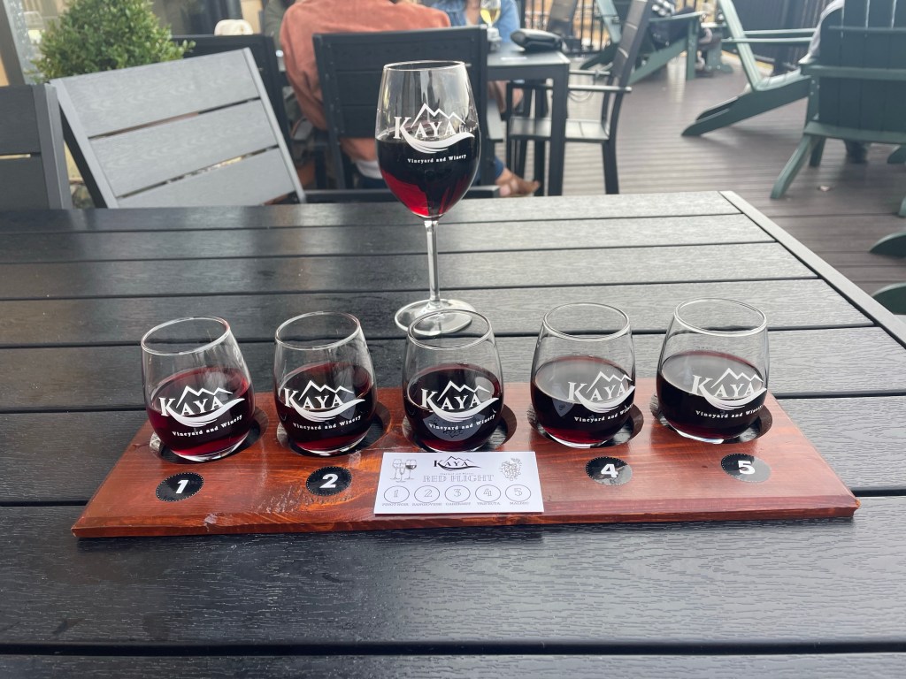 Kaya Winery + Vineyard was extremely fun! This is one of the largest vineyards in the Dahlonega area and has a lively atmosphere. Once entering, you’ll discover a warm and friendly environment at the inside bar and gift shop. Enjoy either a glass or a flight of their wine while admiring the breathtaking panoramic views of the Blue Ridge Mountains from the wrap around patio + porch.