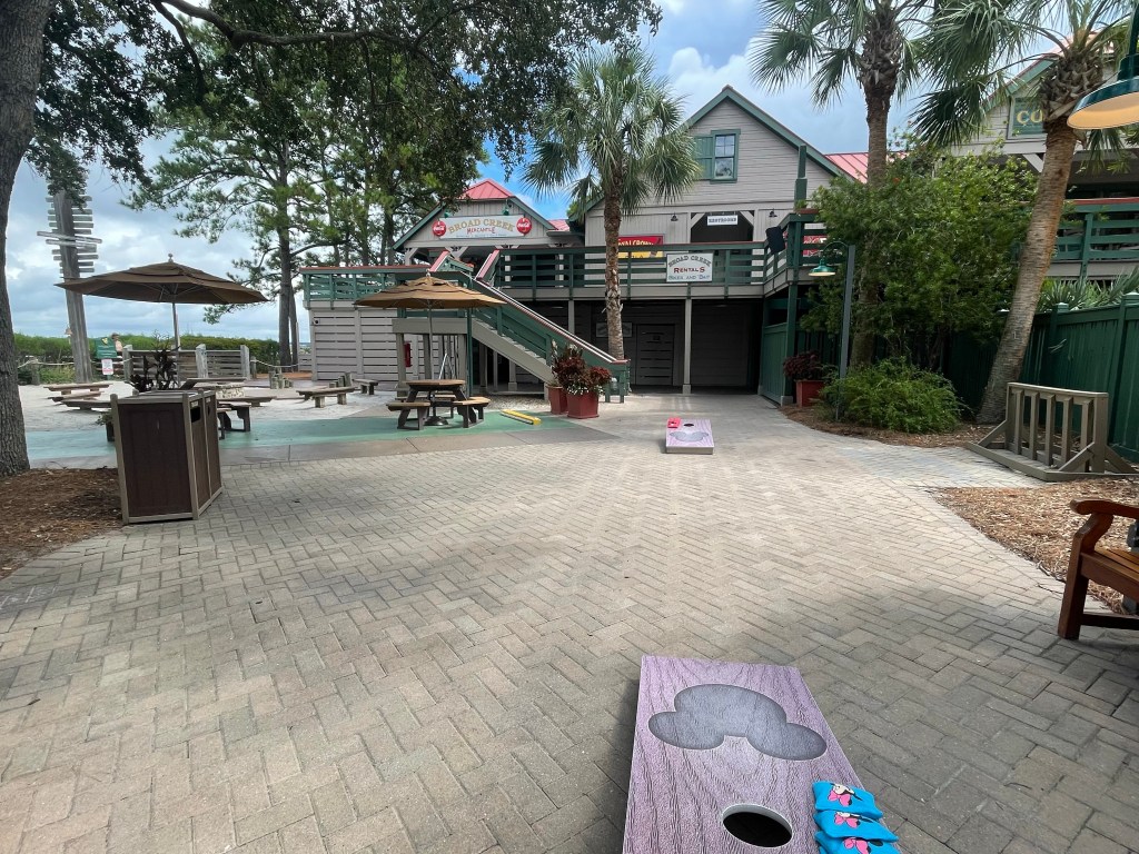 With this property on Broad Creek River, there’s unfortunately no direct beach access from the Resort itself. They are creative enough to have its own Beach House located on the Atlantic Ocean, with shuttle service to and from the Resort. This House is beautifully done, containing its own pool, quick service restaurant, bar, and other activities; all which have hours that are subject to change. They do have plenty of parking spaces whether you want to drive or bike over and do offer a shuttle service from entrance of the Resort (near Live Oak Lodge) to the entrance of the Beach House.