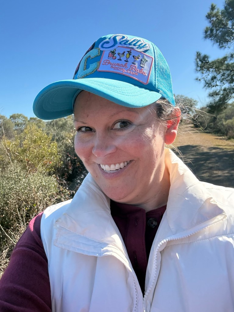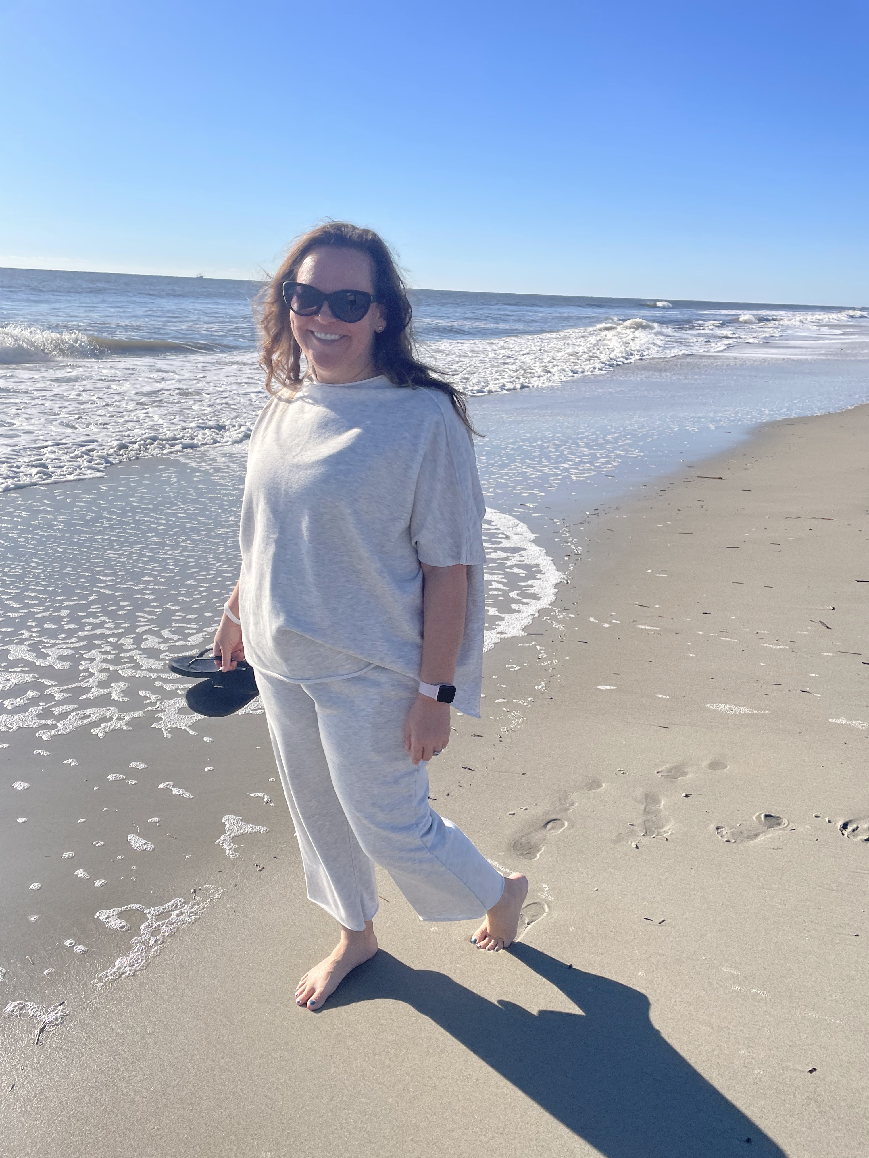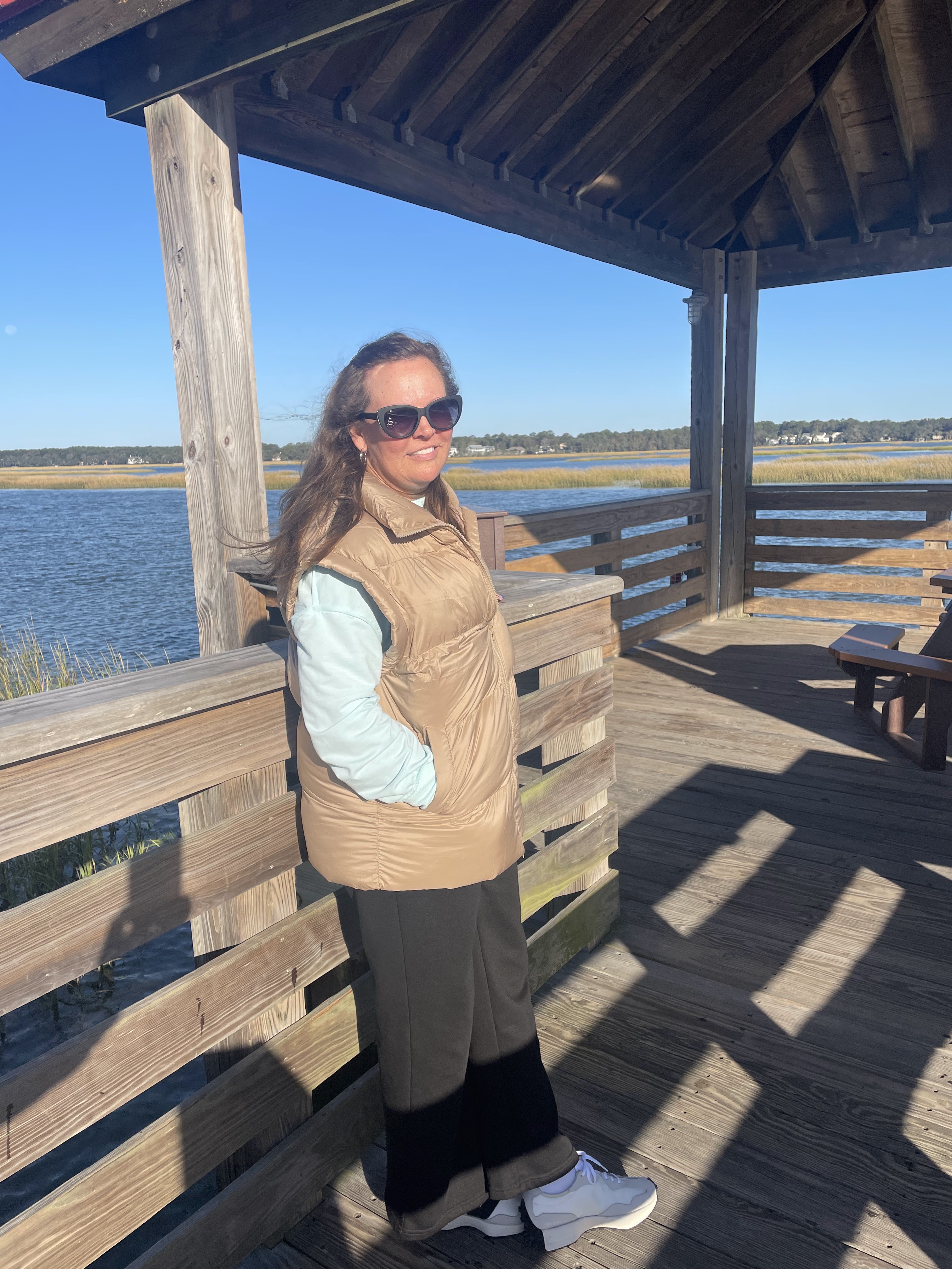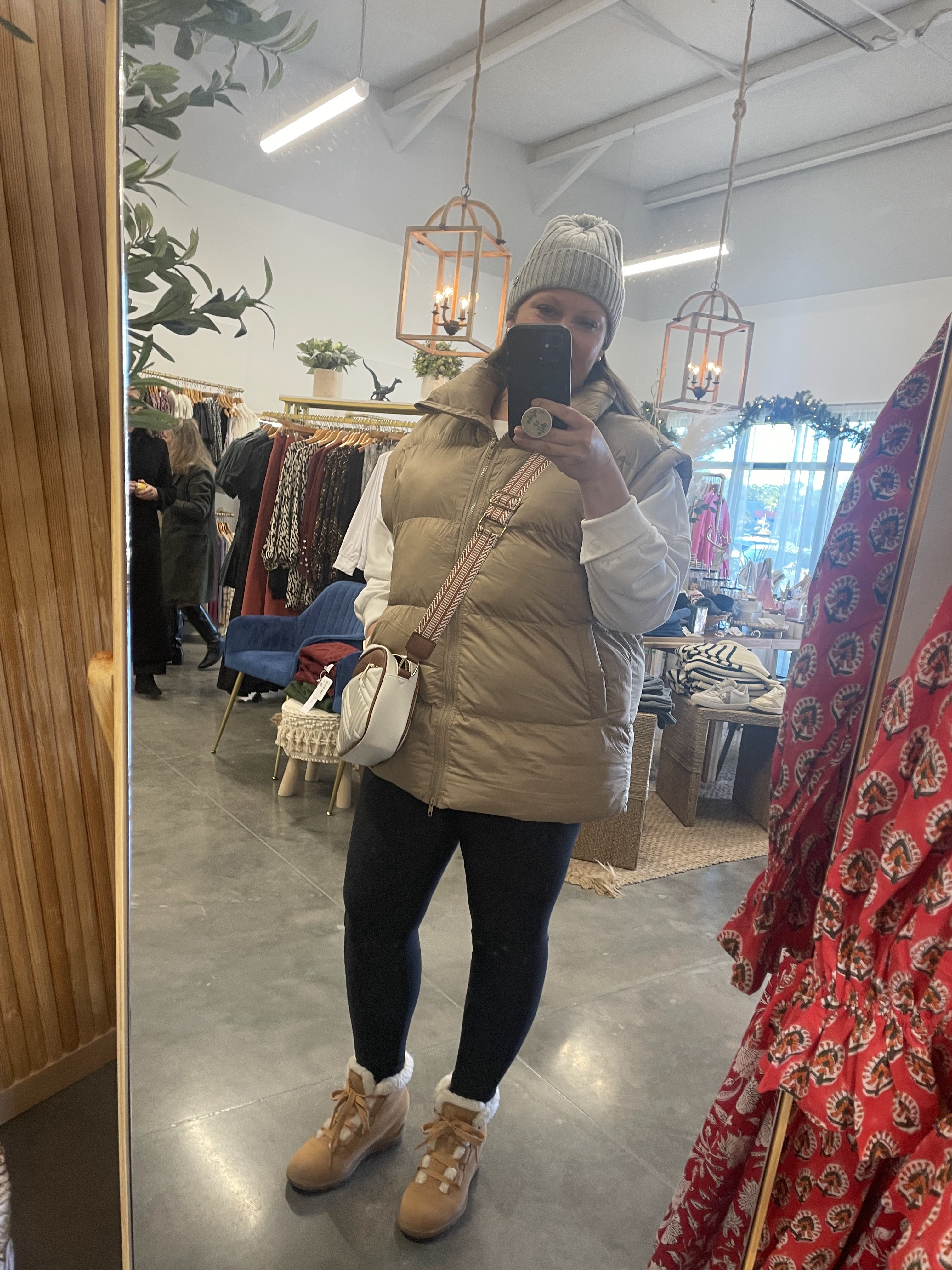 Grey Beanie | Khaki Sleeveless Puffer Vest | White Long-Sleeved T-Shirt | Fleece Leggings | Sorel Evie Cozy booties | Purse
