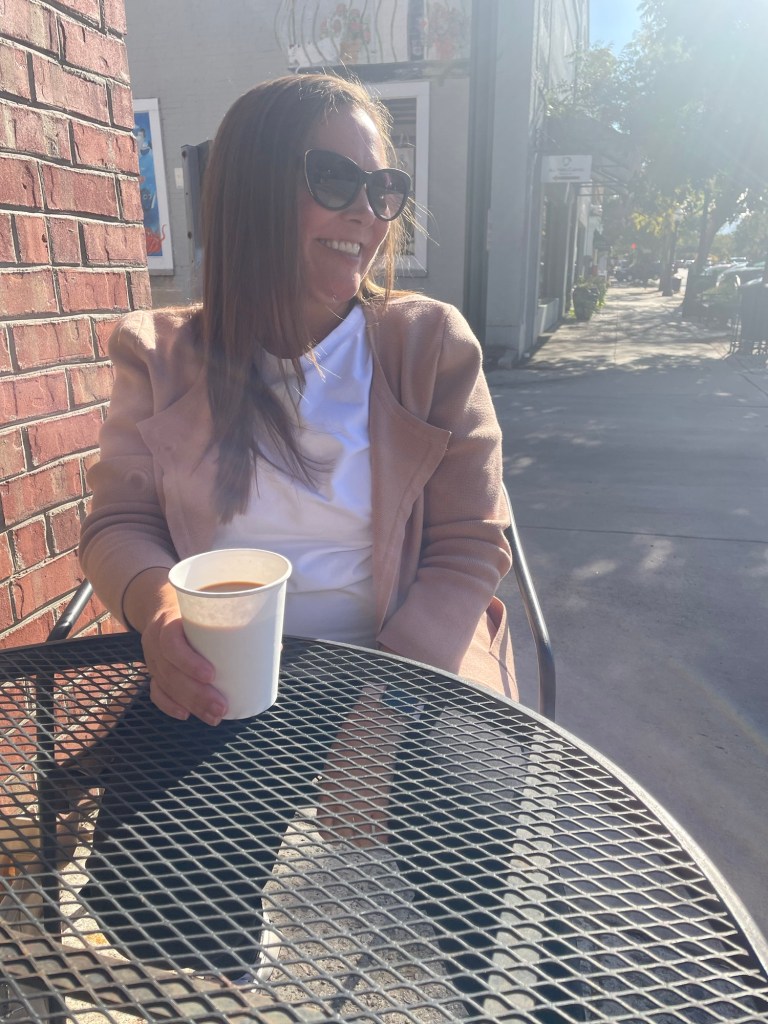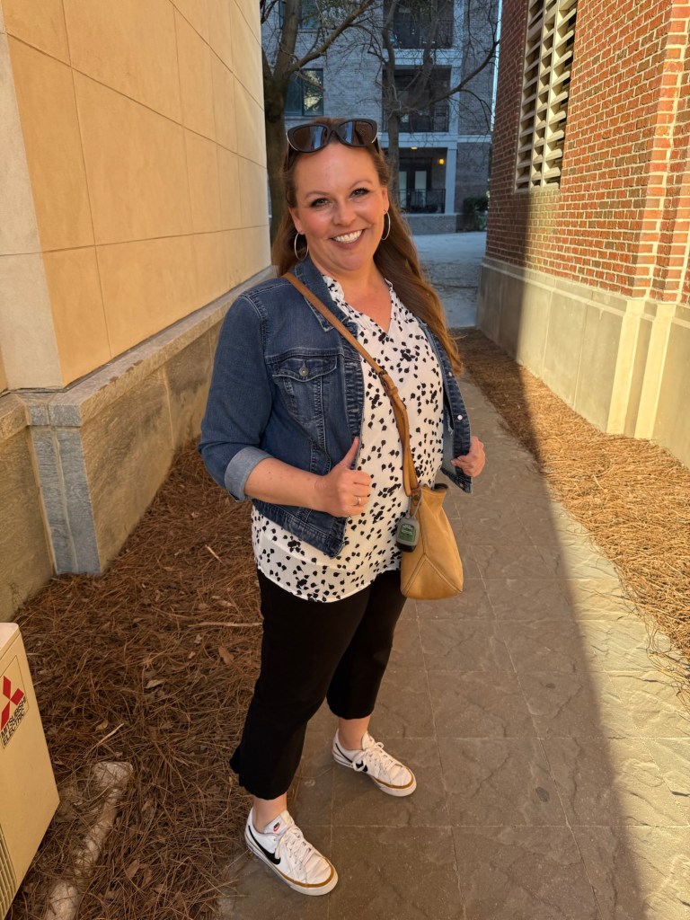 Sunglasses | Maison Jules bluejean jacket | Amazon top | Quince Flare Pants | Nike shoes